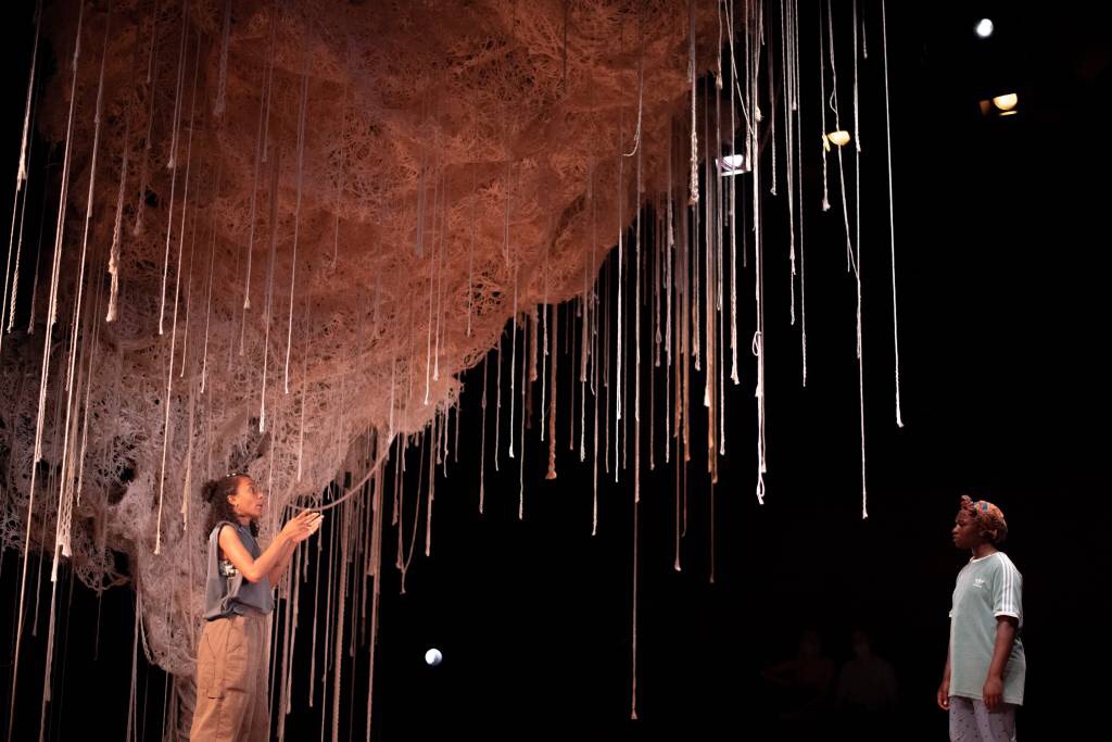 Milli Bhatia’s production, played out under an immense stringed canopy by Rajha Shakiry like an art-installation representing all the strands of the internet but also the mental and physical bondage of Black women down the centuries as it bears down and closes in on Cleo when the play gathers pace, comes at us with a ferocious energy. I wish there was more clarity in the cacophonous sections where innumerable online voices crowd in to comment, mock, abuse or approbate, and the muddied, deafening sound design doesn’t help. The production, exciting as it is, doesn’t fully represent the published script, much of which is ‘written’ as a collage of gifs, memes and internet slang. Maybe a screen would help? I admired the piece as I was watching it but I understood it better reading it on the tube on the way home.