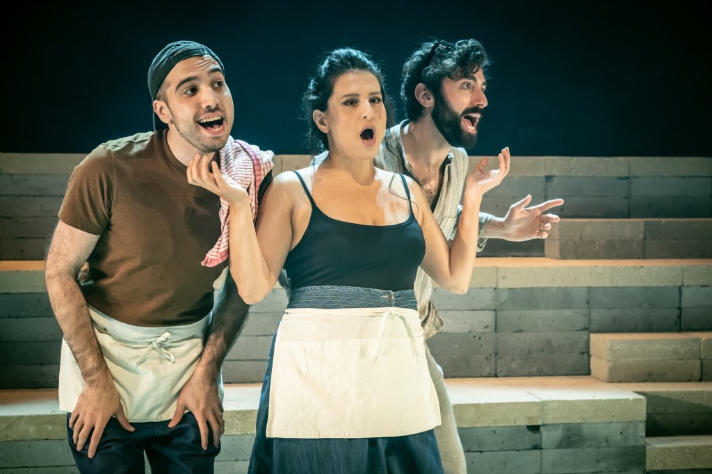 Once again, David Yazbek proves himself a musical chameleon: his scores for The Full Monty, Dirty Rotten Scoundrels, Women on the Verge of a Nervous Breakdown, even the slightly inferior Tootsie, bear so little relation to each other that it’s hard to believe they’re all the work of the same person, so completely does he align his craft each time with the specific style and milieu of the show he’s creating. Here he has come up with an authentic-sounding score unlike anything in the musical theatre canon. It eschews Broadway-style emoting and grandstanding for the evocative dissonance, rhythms and cadences of Middle Eastern music and instrumentation. It often washes over the audience like a warm breeze, but thrills the blood when it has to. There’s a bona fide stand-out number in ‘Omar Sharif’, a gorgeous reverie where café owner Dina sensuously recalls a childhood watching Sharif and listening to Egyptian chanteuse Umm Kulthum (“dark and thrilling, strange and sweet…we dance with them in a jasmine scented wind”) to an understandably entranced band leader (the Israeli film star Alon Moni Aboutboul in an understated but deeply touching performance.)