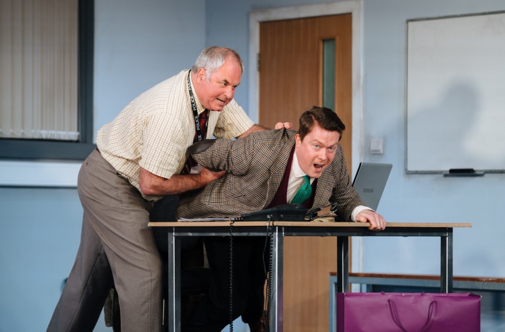 If the rest of a superb cast don’t have as much to sink their teeth into as Rigby – although Tony Gardner’s magnificently venomous Superintendent who marries dishonesty, aggression and fecklessness to sublime comic effect, comes pretty close – they are all inhabiting the same twilight world where anything could happen (and usually at high speed and maximum volume) but is taken deadly seriously. From the simmeringly nasty but bone-headed senior policemen of Howard Ward and Jordan Metcalfe, to Ruby Thomas’s Sloane Ranger newspaper reporter and Shane David-Joseph’s delightfully gormless constable, nobody plays for laughs, and the combination of deadpan and delirium ensures that a delighted audience hardly ever stops laughing.