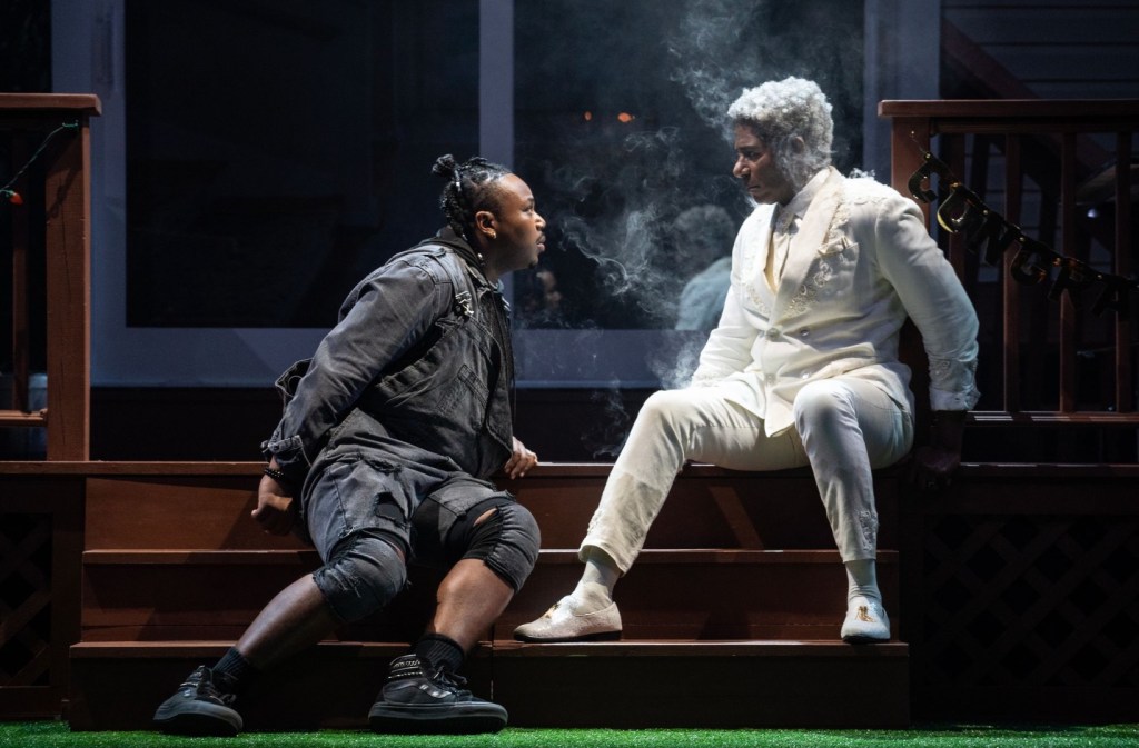 Maruti Evans’s house-porch set is fascinating, looking realistic at first, but becoming more and more artificial the longer you scrutinise it, and appears a useful metaphor for Fat Ham’s relationship to Hamlet, but then undergoes a stunning (and, one would imagine, costly) transformation which has to be seen to be believed. Dominique Fawn Hill’s costumes and Brad King’s lighting are equally vivid and ingenious. Skylar Fox’s illusions add a layer of authentic magic. The crowd pleasing ending is the stuff theatregoers memories are made of, so much so that it seems a little churlish to point out that it feels more like the writer wasn’t quite sure how to end the play rather than a natural or credible conclusion to what we’ve watched. It’s pretty wonderful as a theatrical moment though.