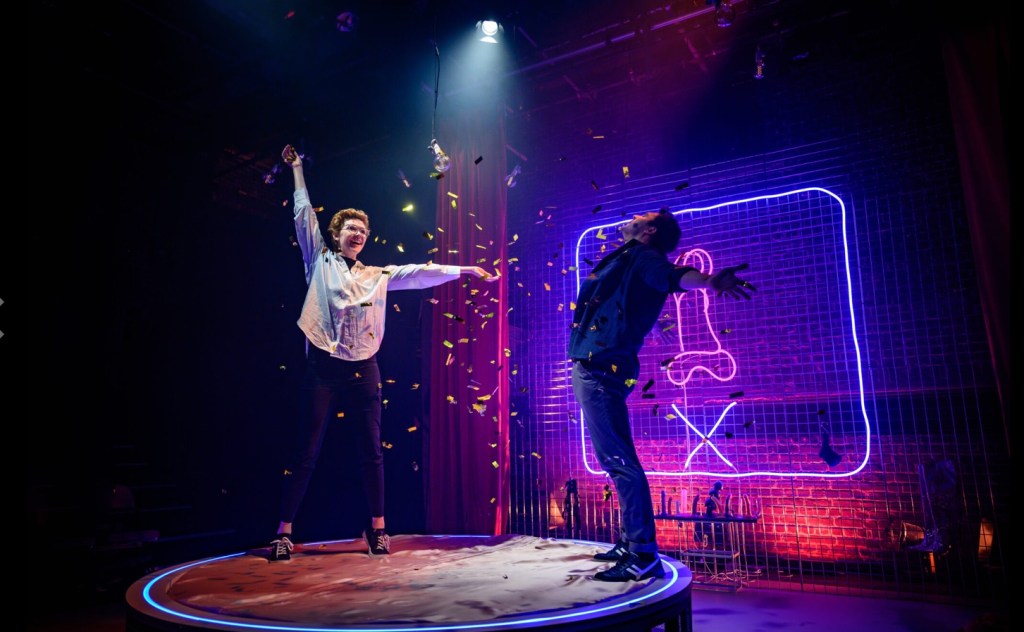 So far so raunchy RomCom, but when one of their sex sessions takes a turn for the unexpected, the play goes seriously off piste and turns into very much its own savagely funny, disturbing beast, as Rachel and Nick get into the unconventional sexual practise of pegging. For the uninitiated, pegging is where a woman straps on a fake phallus and anally penetrates a man, and there is an astonishing moment when the curtains at the back of Cara Evans’s set (which is equal parts combat arena, stand-up comedy stage and lurid sex club) open to reveal a giant neon penis and an eye-watering array of sex toys that remain in full view for the rest of the evening.