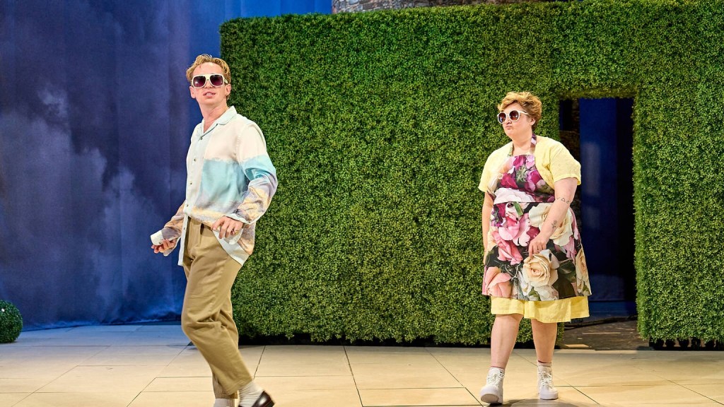 “It’s not like we’re going to be winning any theatre awards any time soon” says Laurie Kynaston’s debauched modern day fop, improbably disguised as a Russian oligarch visiting a dilapidated stately home on the North East coast of England, in a meta moment from this strange but appealing new comedy at the Royal Court. “I highly doubt we’ll be nominated” rejoinders Natalie Dew as his Sloane Ranger-ish heiress girlfriend, also in disguise as an oligarch, this one the bearded, seafood-obsessed brother of Kynaston’s. They’ve got a point….well, unless this years illustrious ceremonies add a category for ‘Weirdest Play of the Year’.