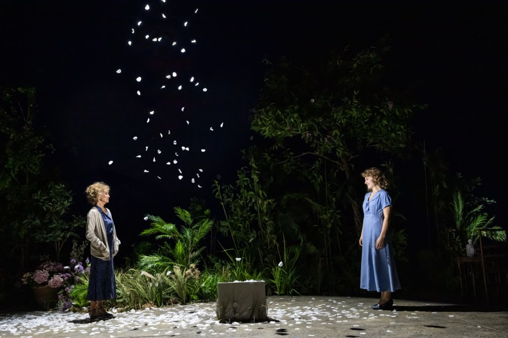 Indian Ink was originally a radio play entitled In The Native State, and the multiple changes of location and time period continue to strongly suggest that. Jonathan Kent’s visually arresting production is great at pointing Stoppard’s pithy dialogue, which is sharp and witty then suddenly surprisingly heartfelt, and just occasionally winningly crude. The bluey-black hues of the visual aesthetic are attractive and appropriate: Leslie Travers’ rising and falling flower-bedecked sets and Peter Mumford’s lighting evoke both ink and the skin colour depicted by traditional Indian painters when portraying the supreme Hindu deity Krishna, whose loric presence runs throughout the text.