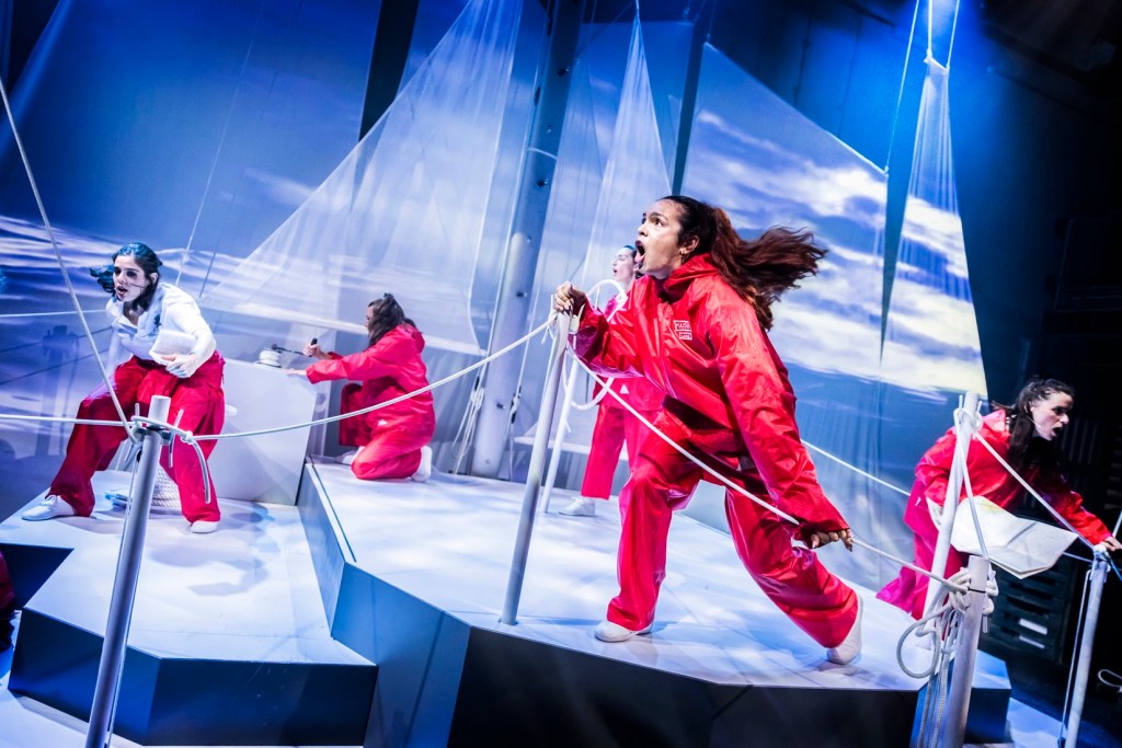 Visually, it’s rather splendid. The set is a series of platforms, ropes and screens that gradually, excitingly takes the shape of a boat as the performance progresses. Jack Baxter’s video design conjures up serene waters then a roiling, turbulent sea beneath dark cloud-scudded sky in a thrilling, terrifying storm sequence (further enhanced by Dominic Bilkey’s sound and Adam King’s lighting design, both contributions vivid and ingenious). Overfield Wilkinson choreographs as well as directs, and has her cast sliding, staggering and pitching to simulate being at sea in extreme conditions. This is boldly effective, imaginative theatrical storytelling of the highest order and, in all honesty, it’s more effective than the actual material.